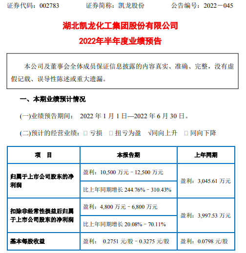 挖贝网7月13日,凯龙股份(002783)(002783)近日发布2022年半年度业绩预告,报告期内归属于上市公司股东的净利润10,500万元–12,500万元,比上年同期增长244.76%–310.43%;基本每股收益0.2751元/股–0.3275元/股。