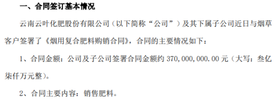 挖贝网11月1日,云叶股份(831663)近日发布公告,云南云叶化肥股份有限公司(以下简称“公司”)及其下属子公司近日与烟草客户签署了《烟用复合肥料购销合同》,合同的主要情况如下: